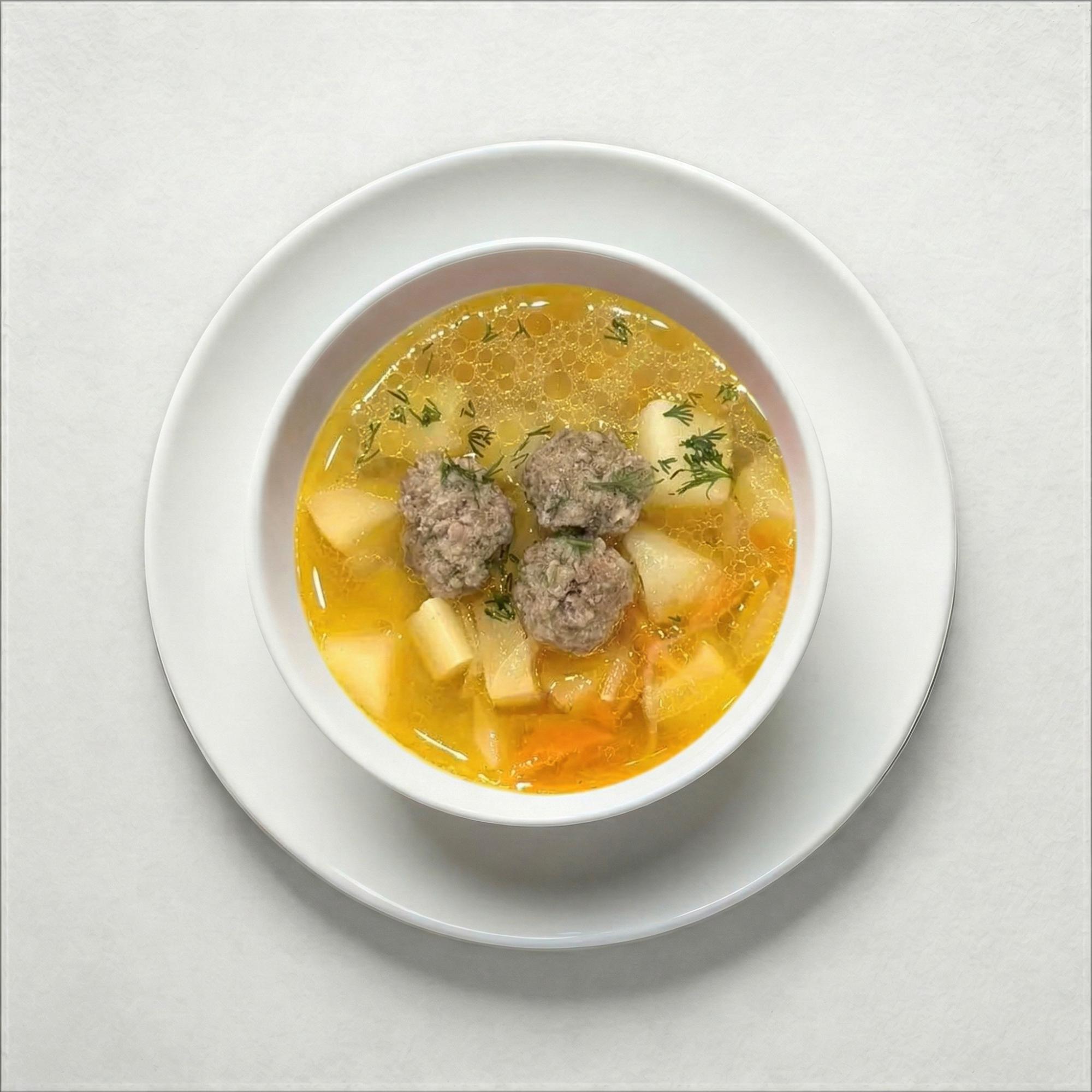 Блюдо русской кухни. Суп на говяжьем бульоне с картофелем, мясными фрикадельками и овощами.